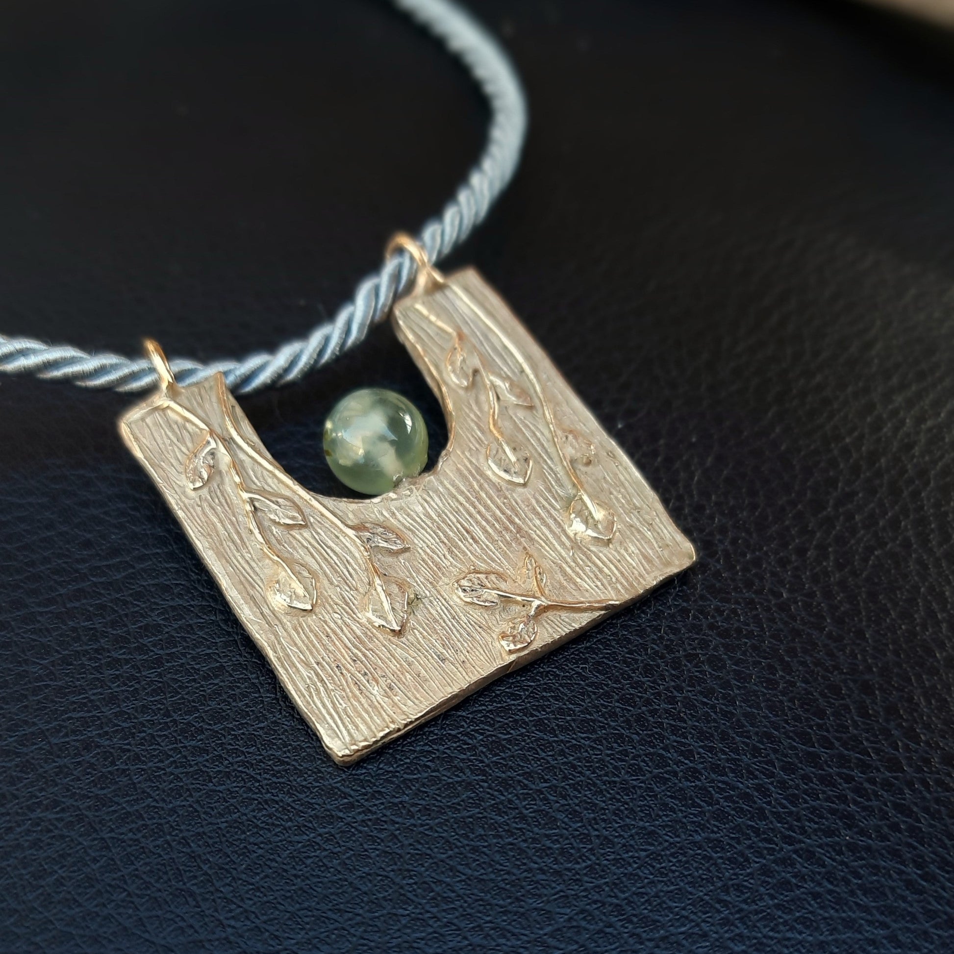 Collana girocollo raffinata che unisce tradizione artigianale e eleganza contemporanea. Il cordoncino in seta grigia, morbido e delicato, sostiene un pendente centrale in bronzo giallo realizzato mediante la tecnica della cera persa, caratterizzato da una splendida sfera di prehnite che cattura la luce con tonalità verdi translucide. I terminali in bronzo giallo, anch'essi eseguiti a cera persa, completano il design con dettagli raffinati. Un pezzo unico che celebra la maestria della lavorazione manuale e la bellezza delle pietre naturali.