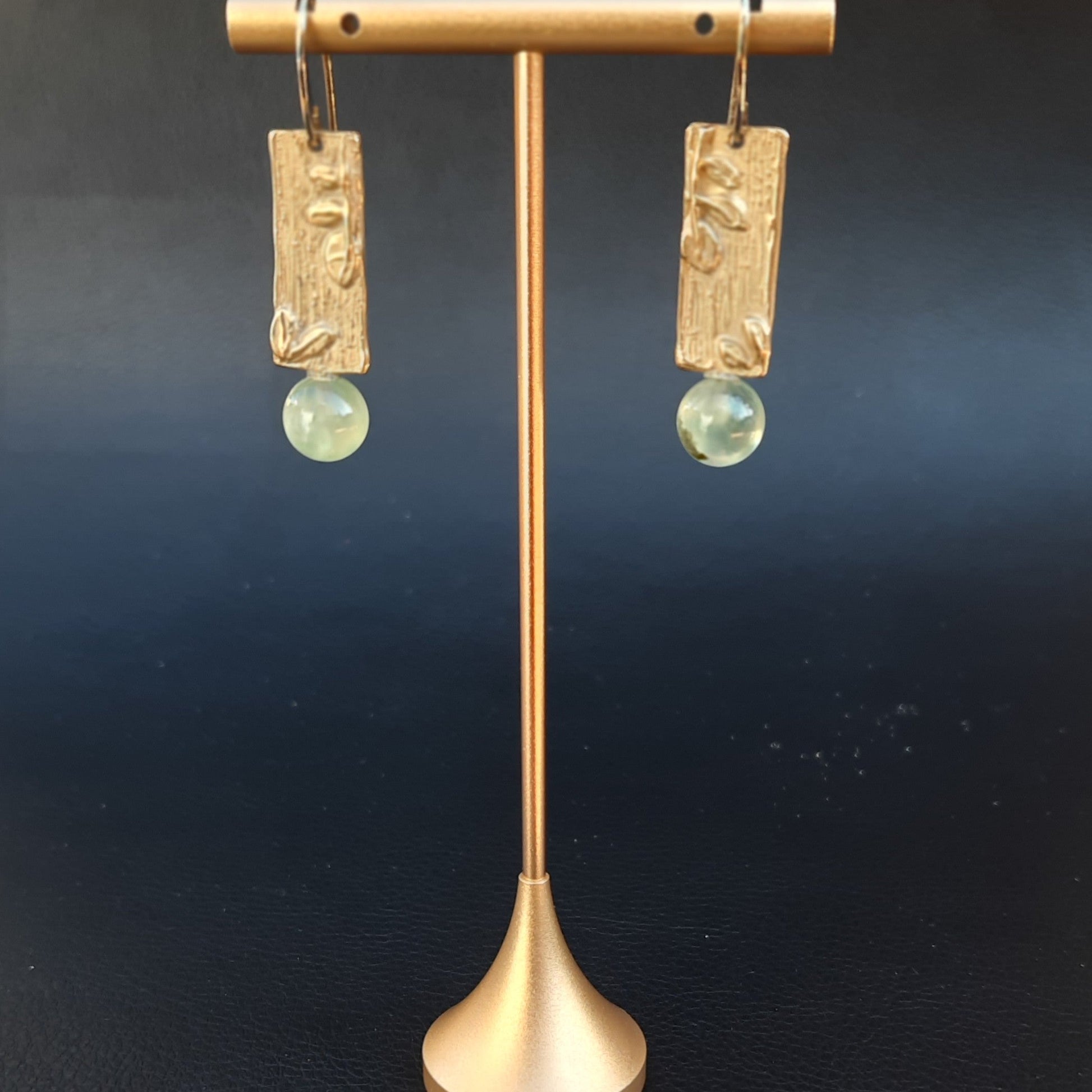 Scopri l'eleganza senza compromessi con questi orecchini pendenti esclusivi. Forgiati in bronzo giallo attraverso la tecnica ancestrale della cera persa, garantiscono unicità e qualità artigianale in ogni dettaglio. Le delicate sfere di prehnite, con le loro sfumature verdi ipnotizzanti, aggiungono profondità e carattere, trasformando un semplice accessorio in un vero statement piece. Perfetti per chi ricerca bellezza autentica e desidera indossare un'opera d'arte che racconta una storia. Un investimento in stile che non passa inosservato.