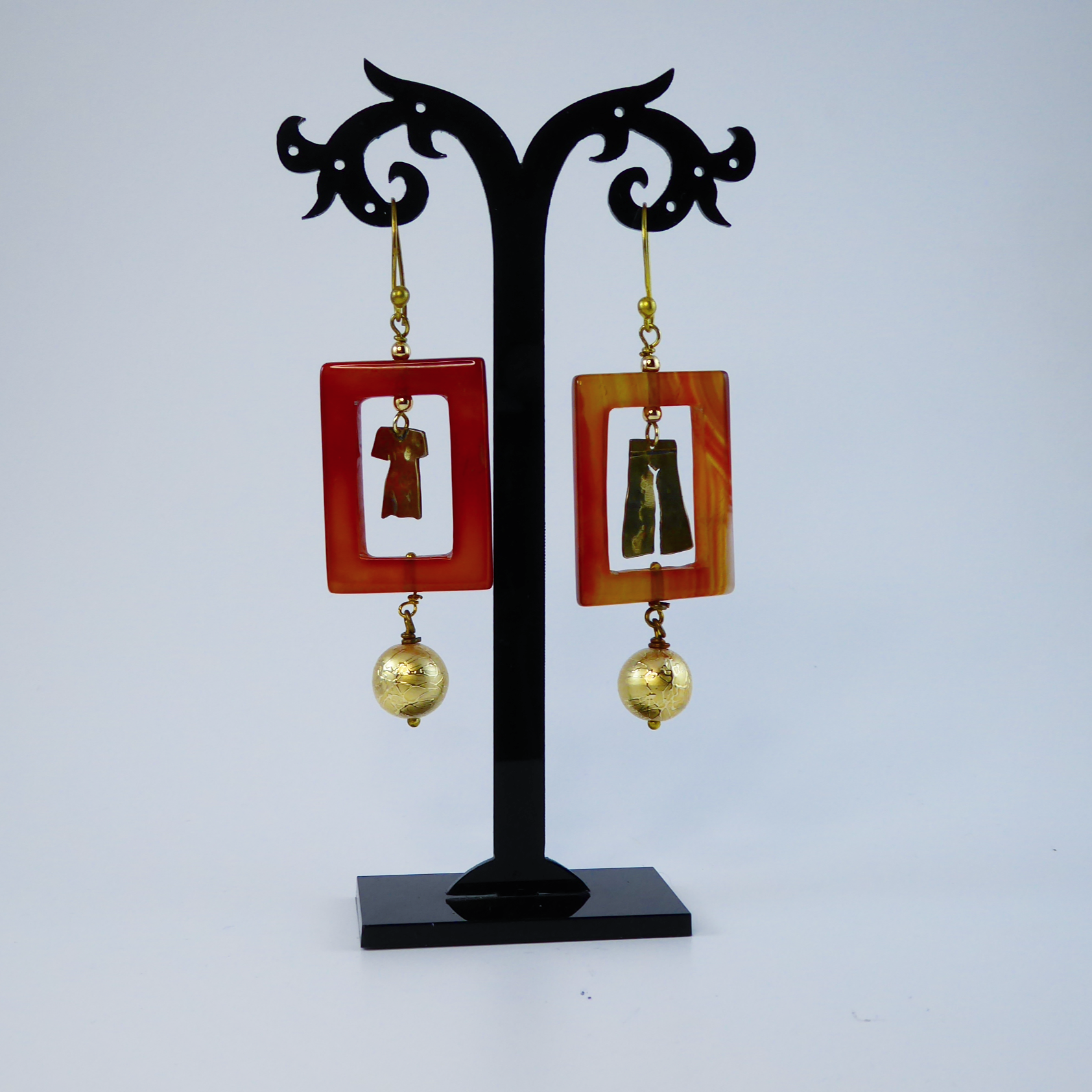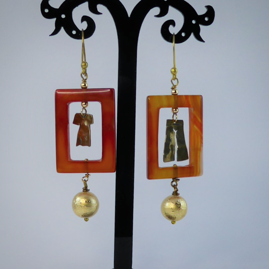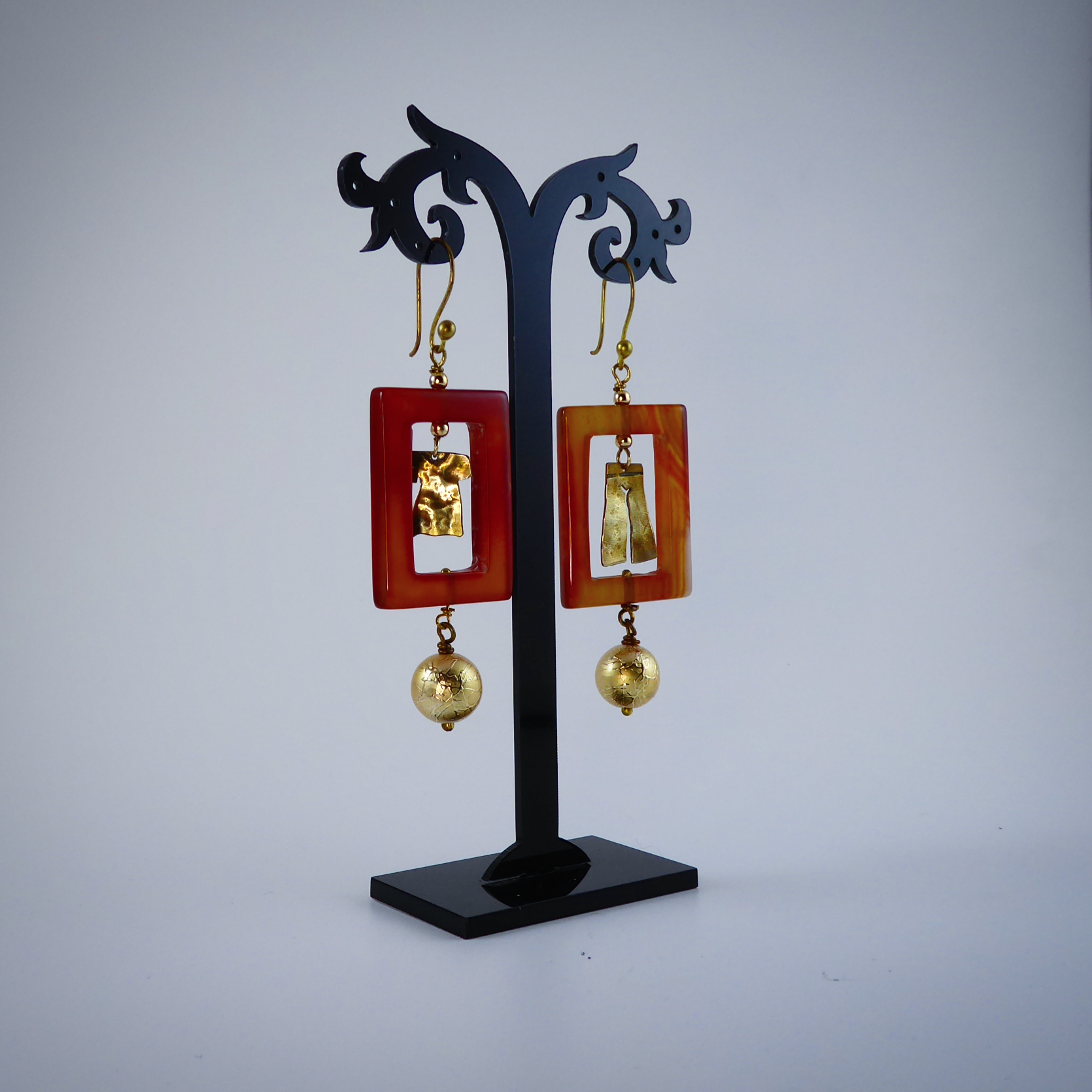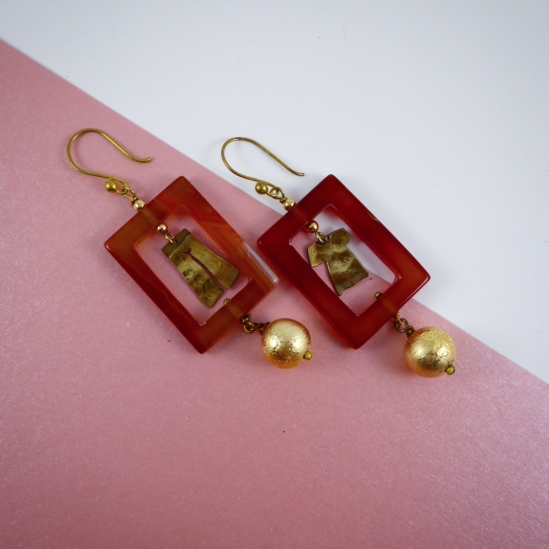 Orecchini in corniola ed elementi in ottone realizzati da lastra e lavorati a mano